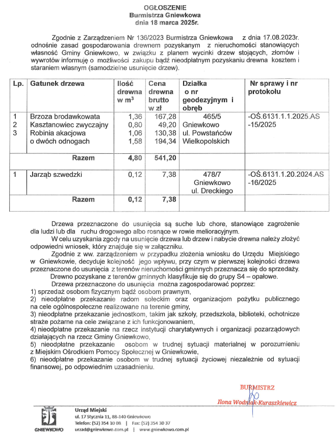 Ogłoszenie Burmistrza Gniewkowa w sprawie możliwości zakupu bądź nieodpłatnego pozyskania drewna kosztem i staraniem własnym (samodzielne usunięcie drzew)
