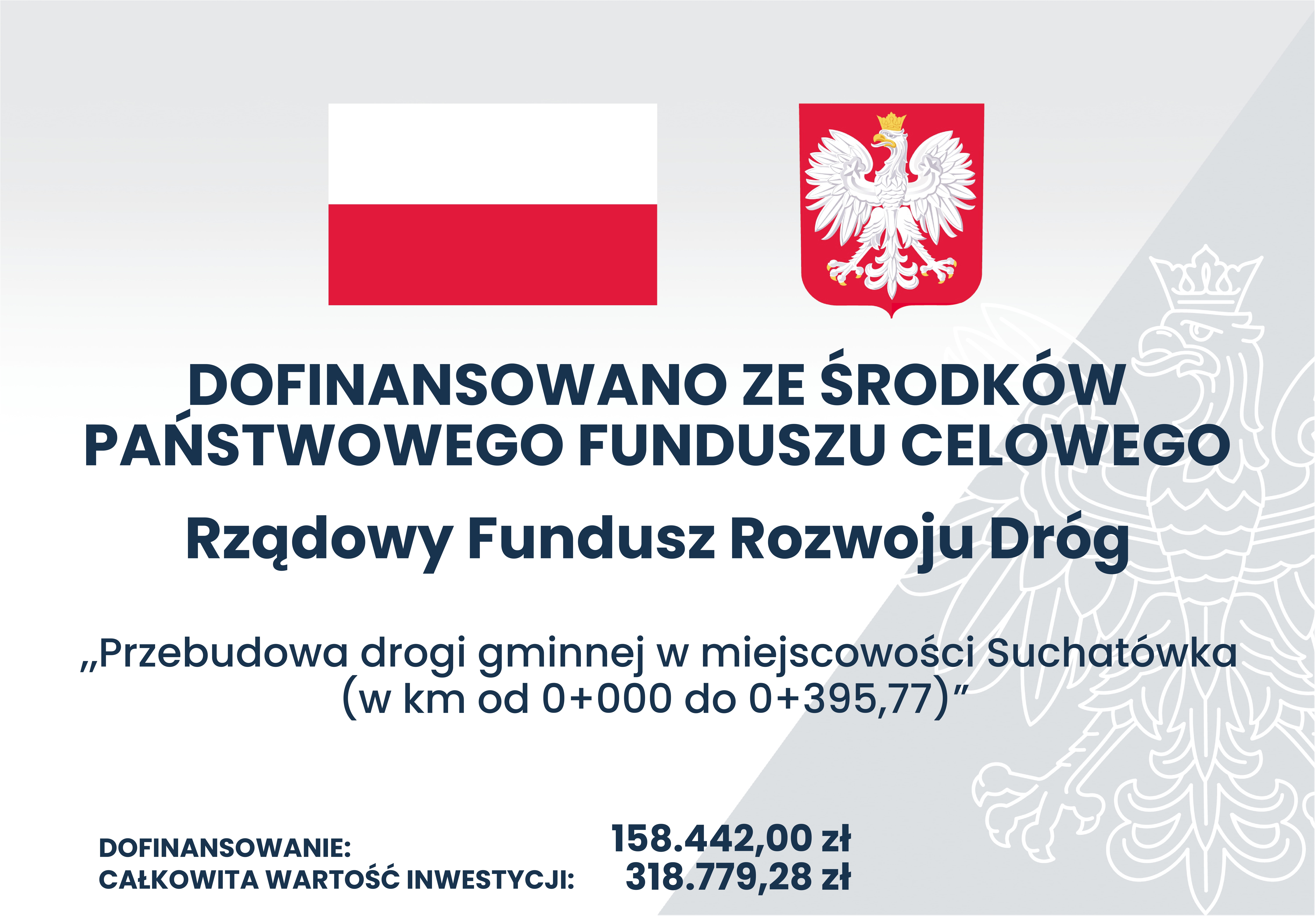 Zakres wykonywanych prac obejmował przebudowę drogi gminnej w Suchatówce na łącznym odcinku 396 m z wykorzystaniem istniejącej nawierzchni, jako podbudowy. Na odcinku 20,88m wybudowano całkowicie nową nawierzchnię. Wzdłuż przebudowanego odcinka ustabilizowano pobocza i obsiano je trawą.