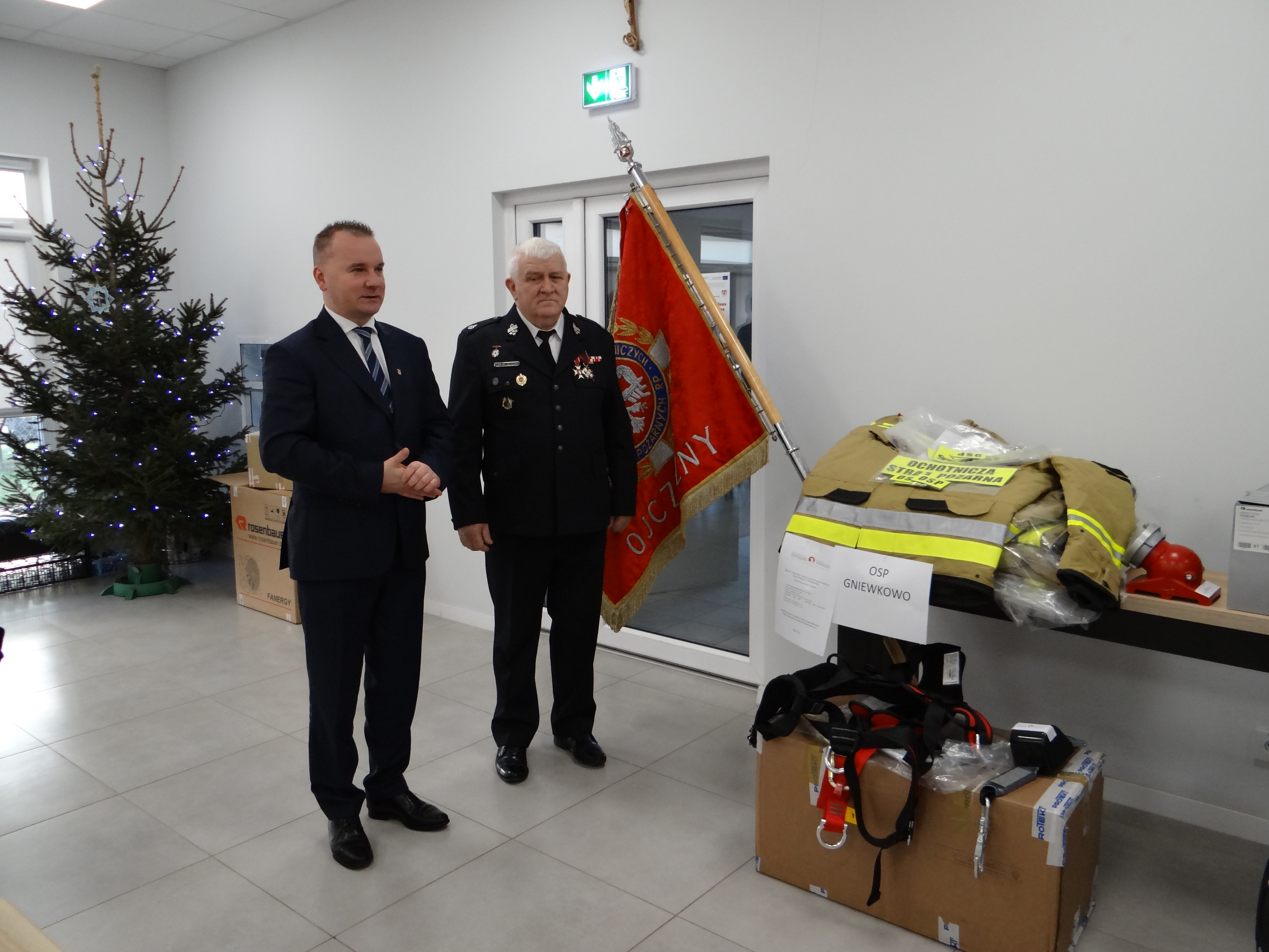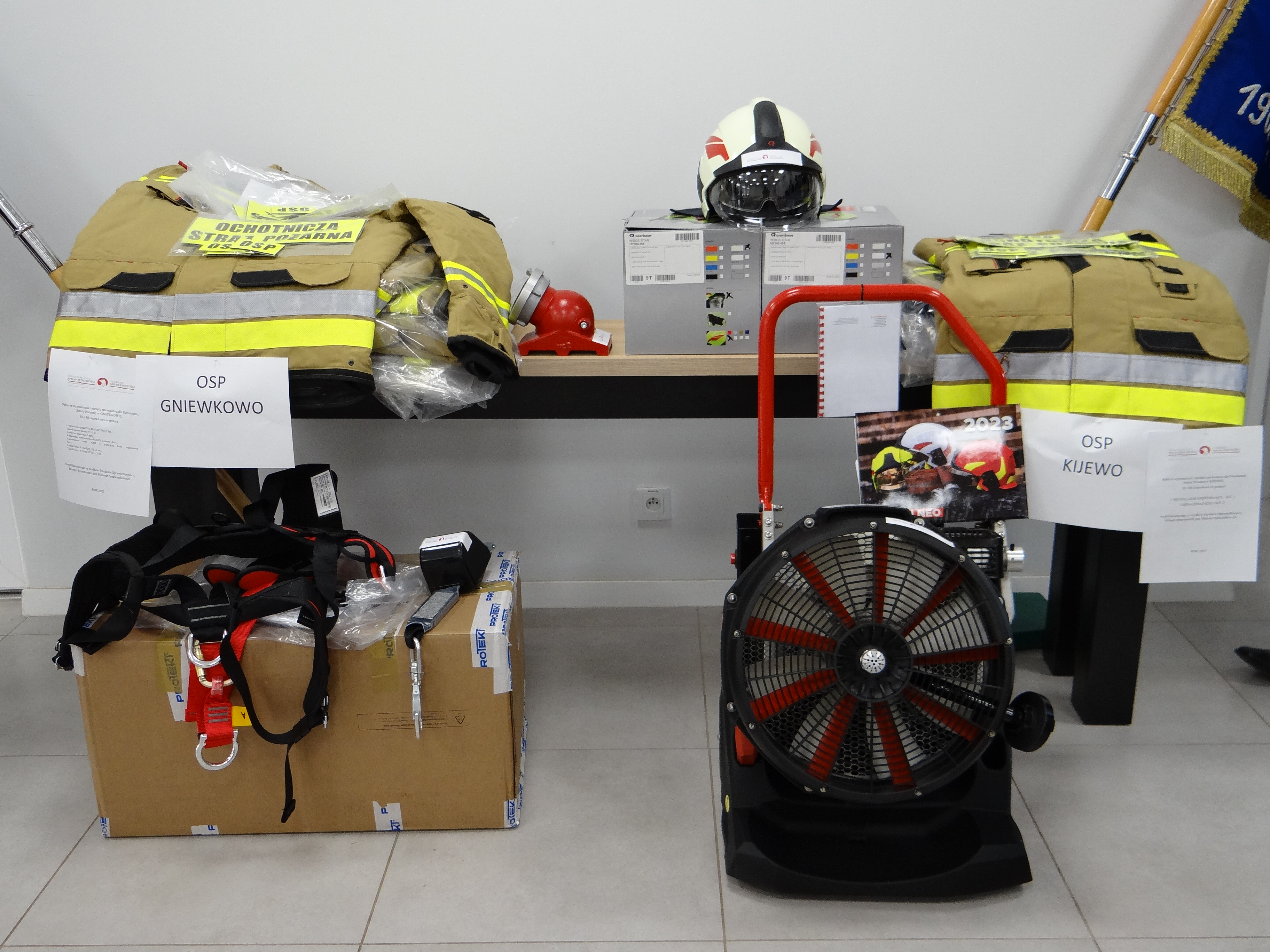 Druhowie z OSP Gniewkowo otrzymali 3 komplety ubrań specjalnych FIRE MAX SF 3, smok ssawny skośny 75, 3 pary rękawic strażackich, 4 sztuki urządzenia samohamownego ROLEX 5 czarny, 4 sztuki amortyzatora bezp. ABM z podwójną linką regulowaną, 2 sztuki szelek bezp. P-71mX(M-XL) oraz 2 sztuki szelek bezp. P-71mX (XXL), Z kolei druhowie z OSP Kijewo wzbogacili się o wentylator oddymiający i 2 sztuki hełmu strażackiego bojowego.